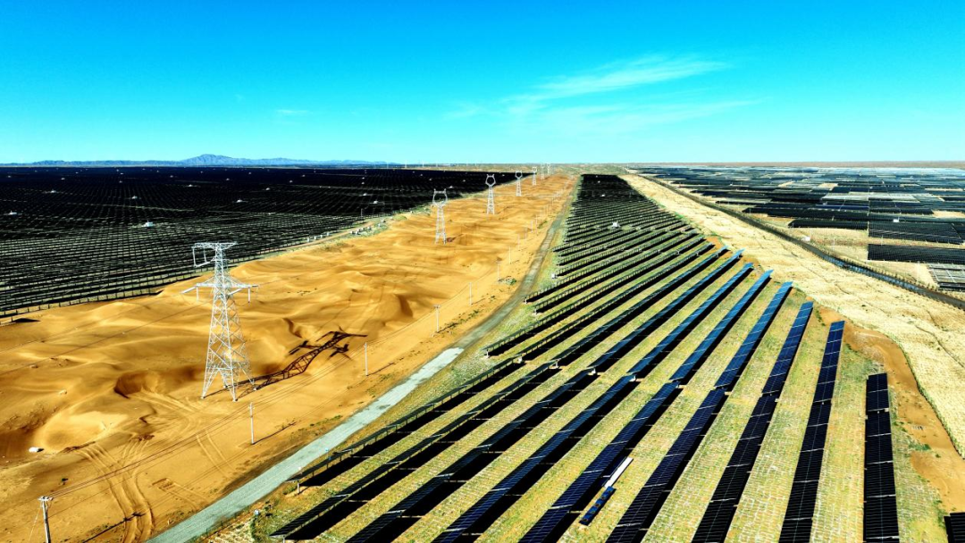 在宁夏中卫的腾格里沙漠,640余万块蓝色光伏板如蓝色海洋,构成了这里的新风景。光伏板下,野生动物穿梭,生机勃勃。一条横跨1616公里的“电力天路”,为湖南源源不断输送绿色电能。这便是“宁电入湘”工程,国家“十四五”电力规划中的关键落子。