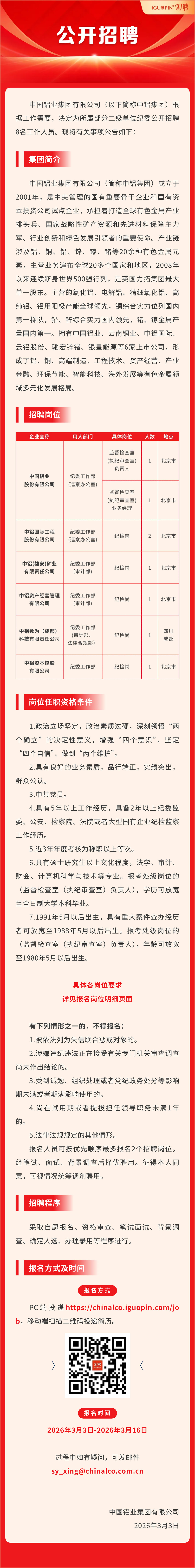 中国铝业集团有限公司二级单位纪委2026年度社会招聘公告